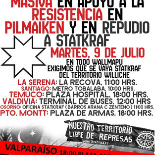 A la opinión pública nacional e internacional, a la Nación Mapuche con fecha 7 de julio del 2019 el Estado terrorista Chileno y Noruego procede a invadir el día sábado 6 de Julio a sangre y fuego nuestro territorio sagrado de la ribera del Río Pilmaiken. Denunciamos que esta acción criminal no contaba con orden judicial alguna, pasando por sobre la orden del tribunal de Río bueno, quienes no autorizaban desalojo.
